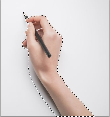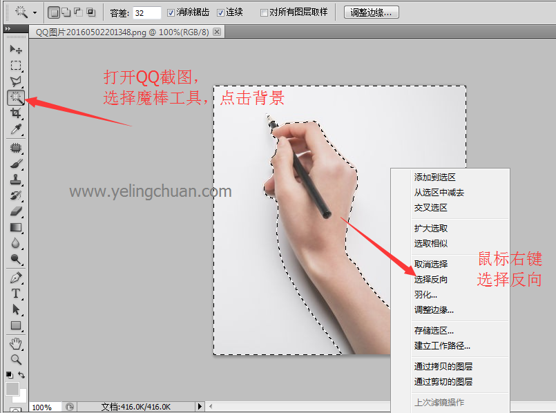 点击下图红框内的“魔棒工具”,在手形之外任意位置点一下,就出现如下图所示的效果,再点击菜单栏“选择”–>“反向”–>(或是鼠标右键单击选择反向)利用快捷键CTRL+x(剪切图片的意思)
