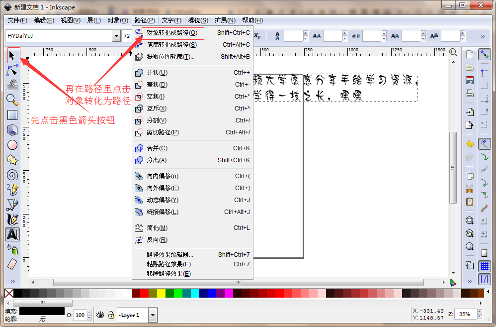 第二步:点击菜单栏“路径”下的“对象转化成路径”